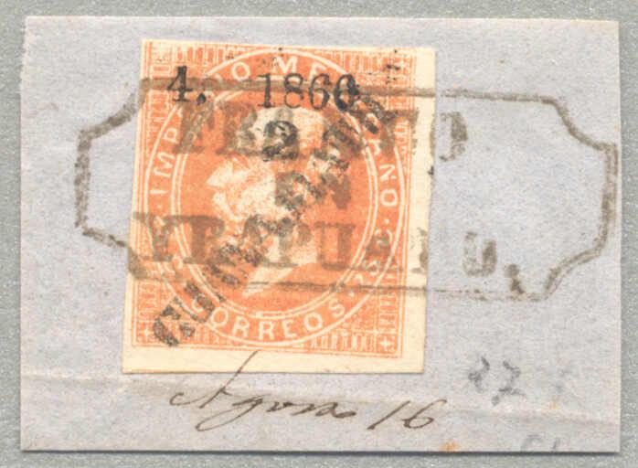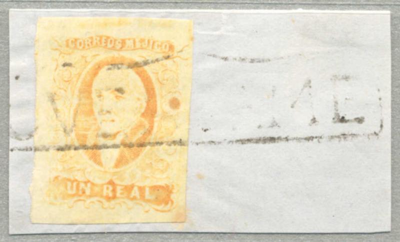 1866, 25c, orange - buff, imperf, lithographed, on piece, GUANAJUATO district opt, used cancel FRANCO EN YRAPUATO (Schatzkes 498), ex Provera, touched at top, still fresh and desirable, F-VF! Schätzpreis 200€.