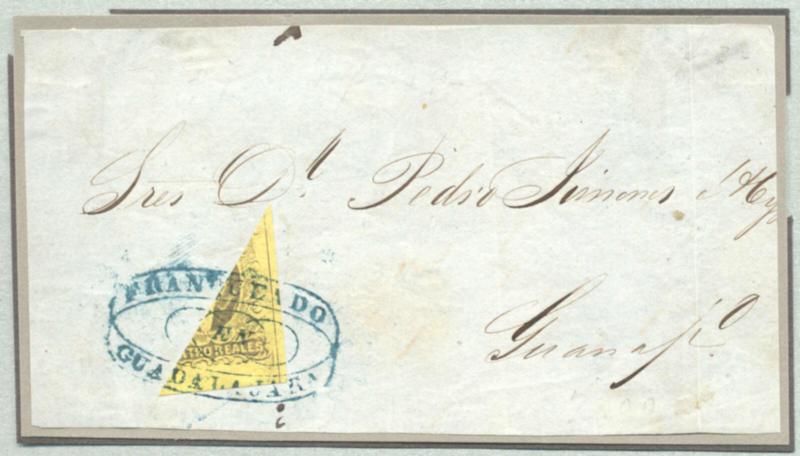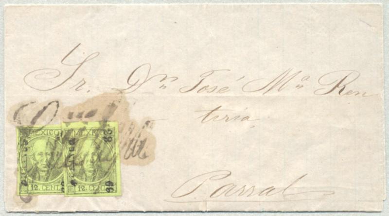 1857, 1+1 real, yellow, pair, district GUADALAJARA, cancelled FRANCO GUADALAJARA on letter to JAPALPA, good margins, fresh letter, attractive, VF-XF! Schätzpreis 600€.