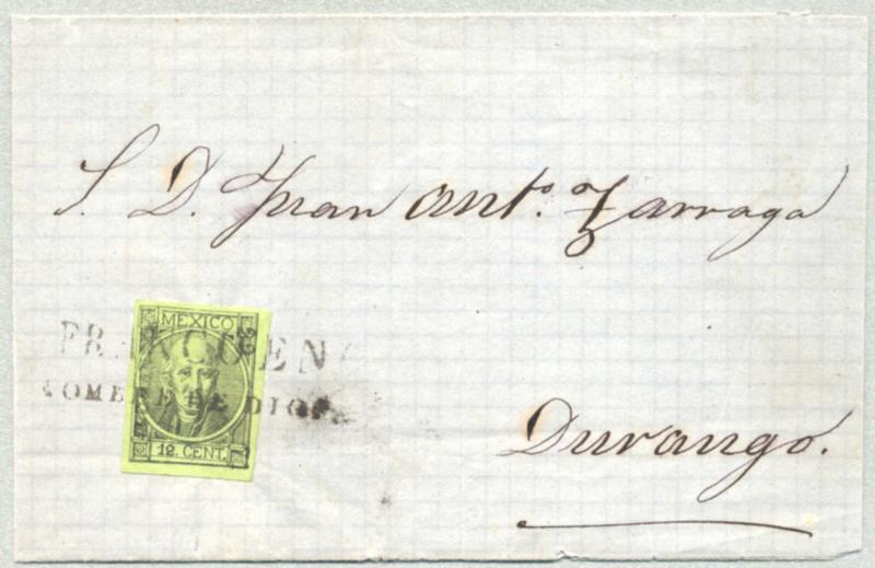 1869, 12c, black/green, imperf, DURANGO district, on letter from NOMBRE DE DIOS to DURANGO, cancelled with FRANCO EN NOMBRE DE DIOS (Schatzkes 277), ex Provera, exceptionally fresh and desirable entire, XF! Schätzpreis 300€.