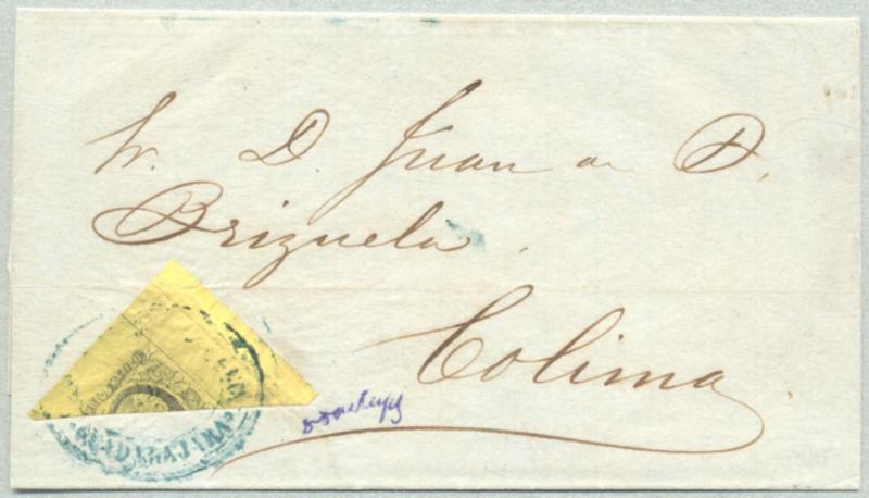 1868, 25c, blue, imperf, COLIMA district, on letter from COLIMA to GUANAJUATO, cancelled with CORREOS COLIMA (Schatzke 179), ex Provera, exceptionally fresh and desirable entire, XF! Schätzpreis 400€.