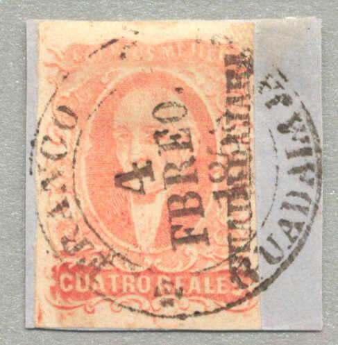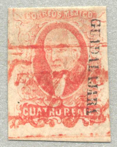 1856, first Hidalgo issue, 4 r, red, with district opt GUADALAJARA, with a clear strike of GUADALAJARA, Schatzkes 297, very fresh and desirable, XF! Schätzpreis 180€.