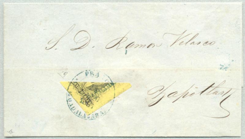1861, 4r bisected, black/yellow, GUADALAJARA district, on letter from GUADALAJARA to ZAPOTLANEJO, cancelled with blue FRANCO GUADALAJARA (Schatzkes 297), ex Provera, signed Todd and E. Diena, side flaps shortened, scarce and very desirable entire, VF-XF! Schätzpreis 600€.