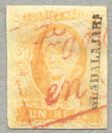 1856, first Hidalgo issue, 1 r, yellow, with district opt GUADALAJARA, with a red clear part strike of FRANQUEADO EN TEPIC, very fresh and desirable, XF! Schätzpreis 150€.
