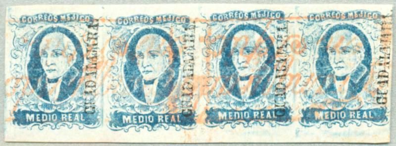 1856, 1/2r, blue, stip of (4), imperf, GUADALAJARA district, cancelled with red FRANQUEADO TEPIC (Schatzke 409), signed Drahn, minor ironed crease, still exceptionally multiple, VF! Schätzpreis 600€.