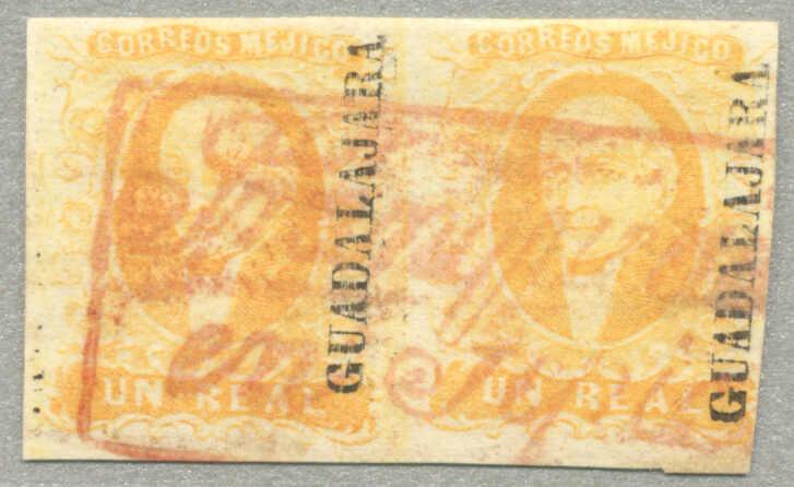 1856, first Hidalgo issue, 1 r, yellow, pair, with GUADALAJARA district opt, with red, clear strike of FRANCUEDO TEPIC (Schatzkes 409), very fresh and desirable, XF! Schätzpreis 350€.