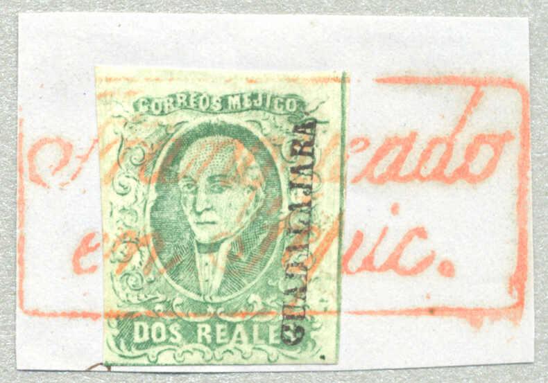 1856, first Hidalgo issue, 2 r, green, with district opt GUADALAJARA, with a clear and complete red strike of TEPIC, used on piece, very fresh and desirable, XF! Schätzpreis 400€.