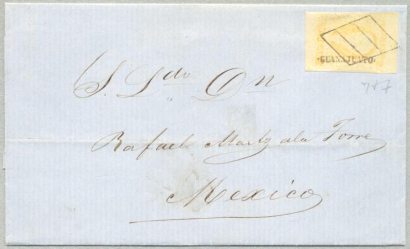 1856, first Hidalgo issue, 1 r, yellow, with district opt GUANAJUATO, with a clear mute cancel (Schatzkes 473), on 1/2 ounce letter from GUNAJUATO to MEXICO, very fresh and desirable, XF! Schätzpreis 800€.