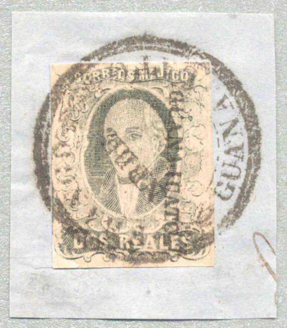 1856, 2 R, green, on piece, GUADALAJARA district name, cancelled YRAPUATO - Schatzkes 494, light diagonal crease, still interesting and desirable, VF! Schätzpreis 150€.