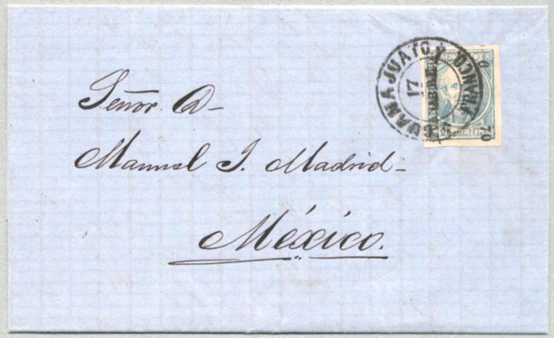 1869, 25c, blue, imperf, GUANAJUATO district, on letter from PANJANO to GUANAJUATO, cancelled with FRANCO EN PANJANO (Schatzkes 515), ex Provera, exceptionally fresh and desirable entire, XF! Schätzpreis 500€.
