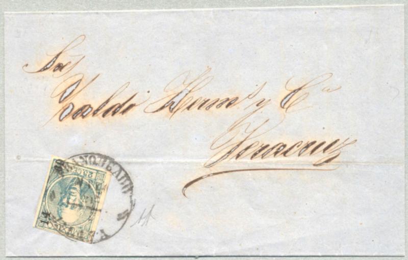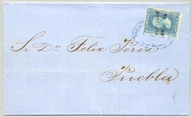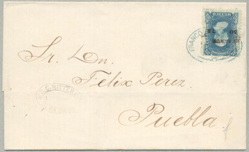 1874, 25c, blue, numerals apart, VERACRUZ district, on letter from VERACRUZ to PUEBLA, cancelled blue FRANCO DE VERACRUZ (not listed in Schatzkes, Schimmer GTO.17/8 O1 blue), ex Provera, fresh and desirable entire, VF-XF! Schätzpreis 200€.