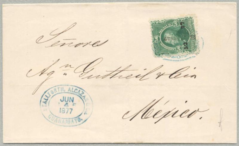 1877, 50c, green, numerals apart, GUANAJUATO district, on letter from GUANAJUATO to MEXICO, cancelled blue FRANCO GUANAJUATO (not listed in Schatzkes, Schimmer GTO.17/8 O1 blue) aside blue company cancel, ex Provera, fresh and desirable entire, VF-XF! Schätzpreis 400€.