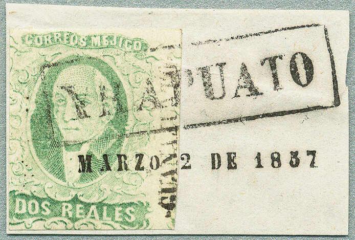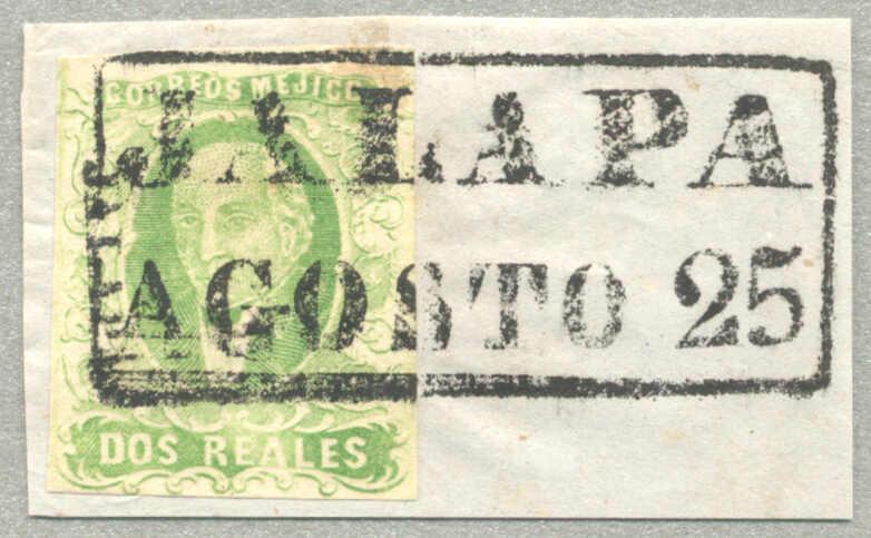 1856, first Hidalgo issue, 2 r, green, with district opt JALAPA, with a clear strike of JALAPA / AGOSTO 25, used on piece, very fresh and desirable, XF! Schätzpreis 200€.