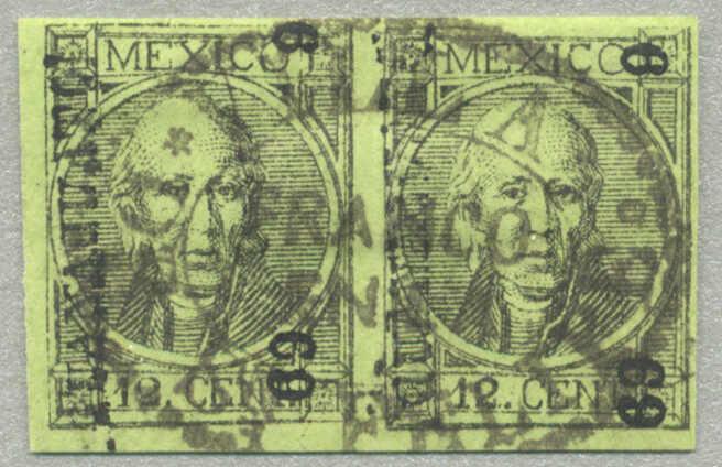 1869, 12c, black/green, imperf, pair, GUANAJUATO district, cancelled with VILLA DE SAN FELIPE (Schatzke 489), ex Provera, exceptionally fresh and desirable, XF! Schätzpreis 400€.