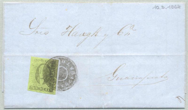 1864, 1r, black/green, on letter from YRAPUATO to GUANAJUATO, cancelled with negative black YRAPUATO (Schatzkes 497), ex Provera, cert Jaretzky AIEP, desirable and fresh entire, XF! Schätzpreis 800€.