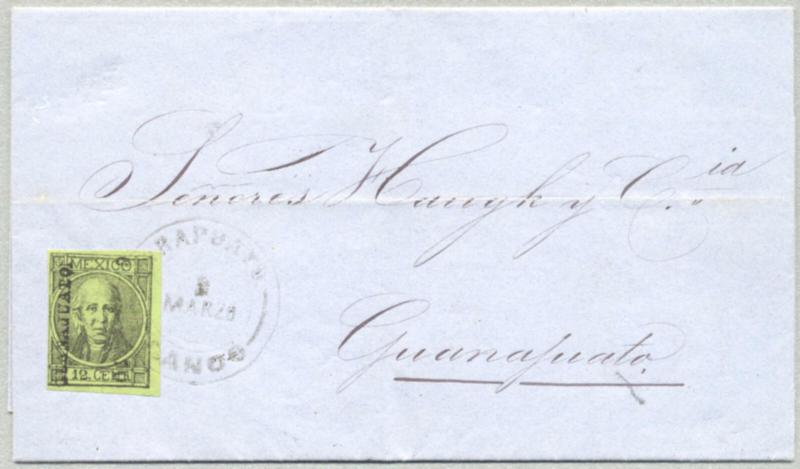1871, 12c, black/green, imperf, GUANAJUATO district, on letter from YRAPUATO to GUANAJUATO, cancelled with circular YRAPUATO (Schatzkes 499), margins all around, close but clear at left, ex Provera, exceptionally fresh and desirable entire, XF! Schätzpreis 400€.