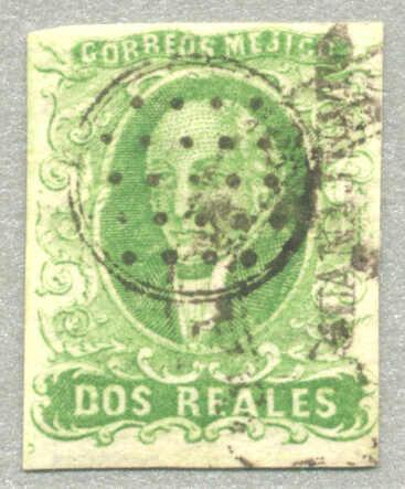 1856, first Hidalgo issue, 2 r, green, with district opt GUANAJUATO, with mute obliterator LEON DE LOS ALDAMOS and pt. strike of GUANAJUATO, very fresh and desirable, XF! Schätzpreis 160€.