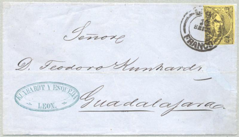 1869, 50c, black/yellow, imperf, GUANAJUATO district, on letter from LEON to GUADALAJARA, cancelled with LEON FRANCO (Schatzke 502), ex Provera, exceptionally fresh and desirable entire, VF-XF! Schätzpreis 400€.