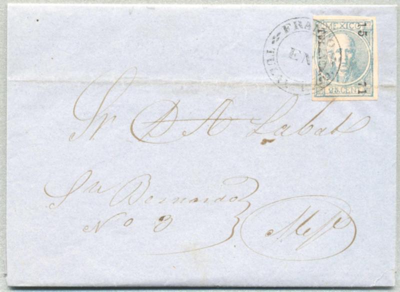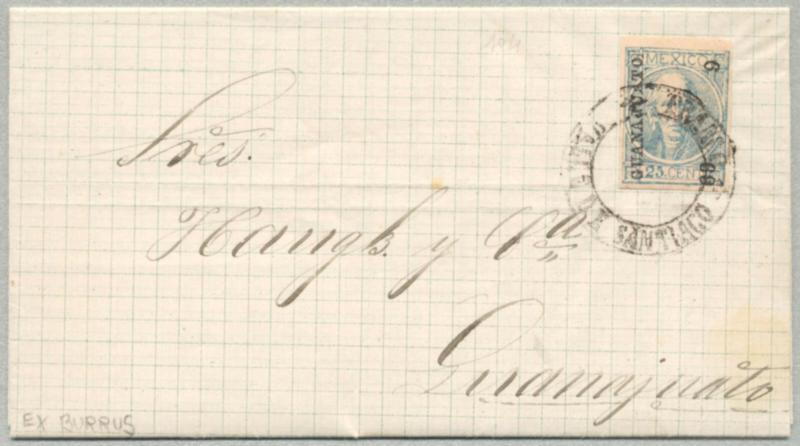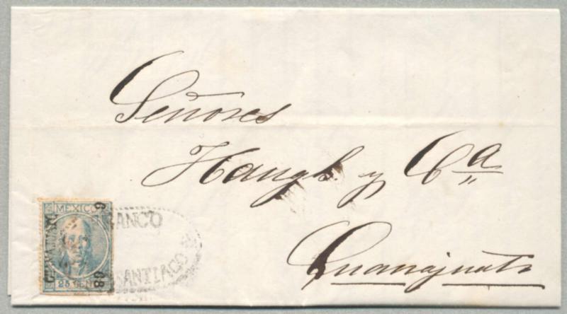 1868, 25c, blue, perf., thick figues, GUANAJUATO district, on letter from SANTIAGO to GUANAJUATO, cancelled with FRANCO DE SANTIAGO (Schatzke 519), ex Provera, exceptionally fresh and desirable entire, XF! Schätzpreis 600€.