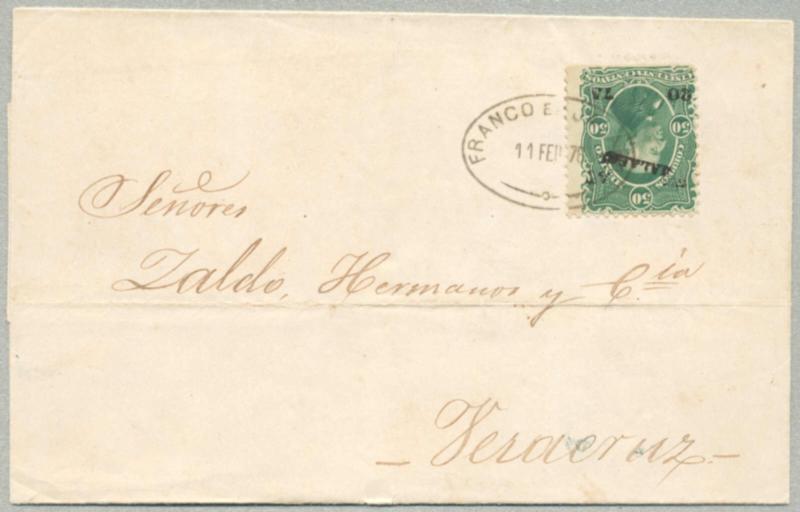 1878, 50c, green, numerals wide apart, JALAPA district, on letter from JALAPA to VERACRUZ, cancelled with FRANCO EN JALAPA (not listed in Schatzkes, Schimmer VER 59/7 O1), ex Provera, fresh and desirable entire, VF-XF! Schätzpreis 300€.