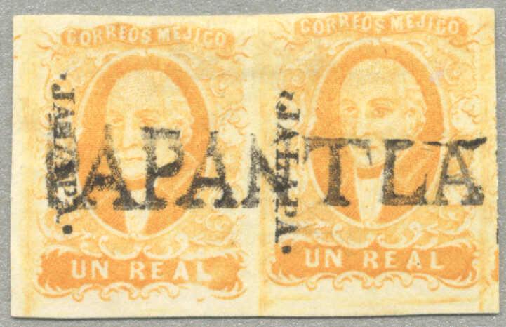 1856, first Hidalgo issue, 1 r, yellow, pair, with JALAPA district opt, with a clear strike of PAPANTLA (Schatzkes 623), very fresh and desirable, XF! Schätzpreis 200€.