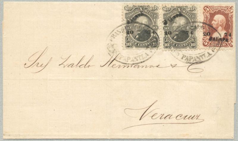 1874, 5+10+10c, numerals wide apart, 5c stamp partly cut with scissors, JALAPA district, on letter from PAPANTLA to VERACRUZ, cancelled with ADMON DE CORREOS DE PAPANTLA (Schatzkes 625), ex Provera, exceptionally fresh and desirable entire, XF! Schätzpreis 600€.