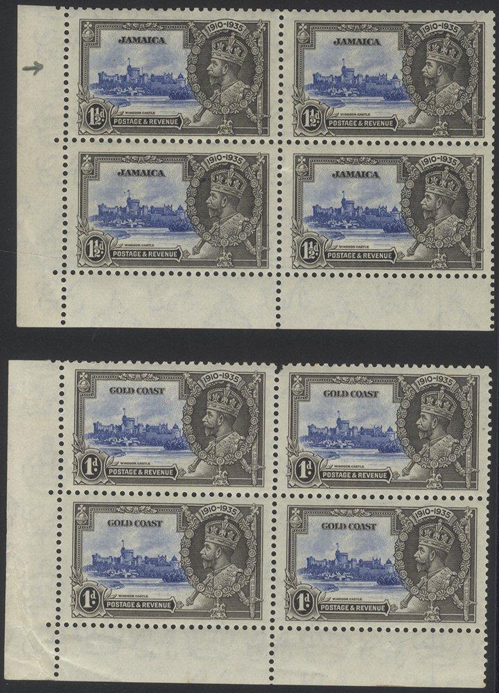 1935 Silver Jubilee - Gold Coast 1d lower left marginal block of four UM with 'extra flagstaff' variety, pulled corner perf affecting one stamp (variety fine), Jamaica 1½d similar block, fine M (showing same variety), SG.113a & 115a. (8) Cat. £235+