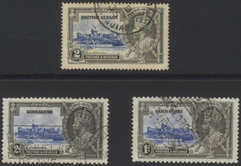 1935 Silver Jubilee varieties (3) comprising British Guiana 2c 'dot by flagstaff' VFU, SG.301h, Gibraltar 2d 'lightening conductor' FU, SG.114c, Gold Coast 1d 'extra flagstaff' FU, single pulled perf at base, SG.113a. (3) Cat. £430