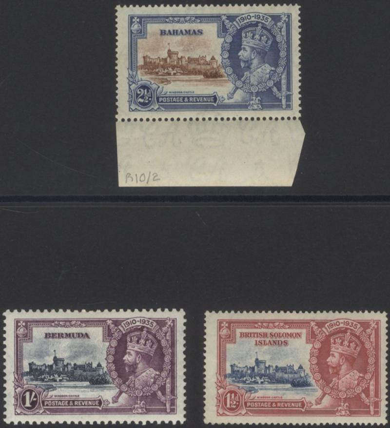 1935 Silver Jubilee varieties (3) comprising Bahamas 2½d 'diagonal line by turret' marginal UM (gum toned), SG.142f, Bermuda 1s kite & vertical log M, SG.97k, British Solomon Islands 1½d 'diagonal line by turret' M, SG.53f. (3) Cat. £570