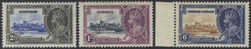 1935 Silver Jubilee 'extra flagstaff' variety on Gibraltar 2d M, Jamaica 1s UM, Trinidad & Tobago 6c UM. Cat. £415