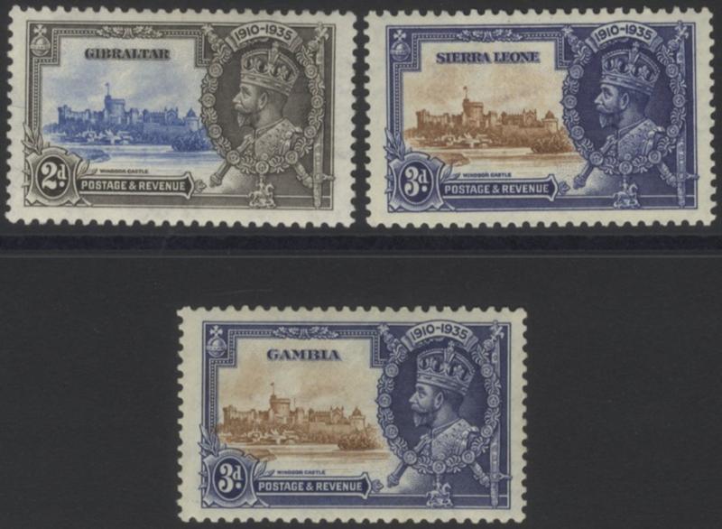 1935 Silver Jubilee varieties - 'lightning conductor' on Gibraltar 2d UM (toning). Sierra Leone 3d UM (both stamp with lightly toned gum), also Gambia 'extra flagstaff' M. (3) Cat. £470