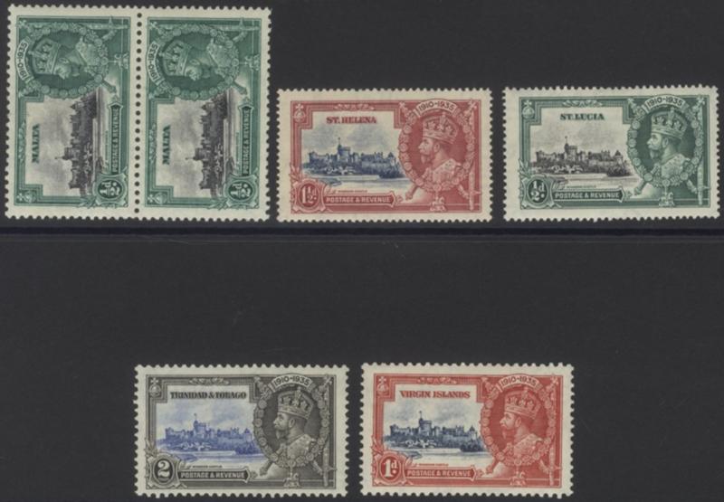 1935 Silver Jubilee varieties selection comprising Malta ½d vertical pair incl. 'extra flagstaff' M, St. Helena 1½d 'line by turret' M, St. Lucia ½d 'line by turret' M, Trinidad & Tobago 2c 'extra flagstaff' M, Virgin Islands 1d 'kite & horizontal log' M. (6) Cat. £376.
