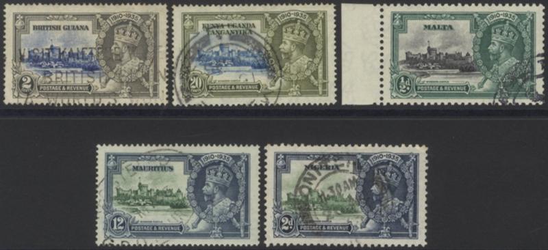 1935 Silver Jubilee varieties on FU stamps comprising British Guiana 2c 'dot by flagstaff,' K.U.T 20c 'dot to left of Chapel,' Malta ½d 'extra flagstaff,' Mauritius 12c 'dot to left of Chapel,' Nigeria 2d 'kite & vertical log.' (5) Cat. £470.