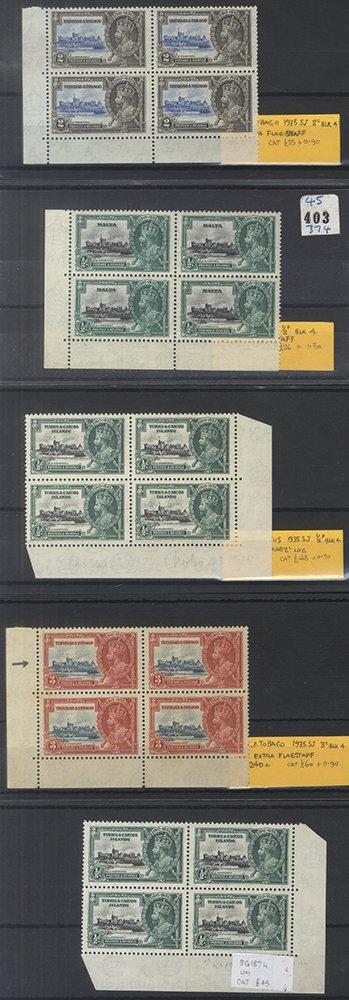 1935 Silver Jubilee varieties - all on corner marginal blocks of four comprising Malta ½d 'extra flagstaff' UM, Trinidad & Tobago 2c 'extra flagstaff' UM, 3c 'extra flagstaff' UM (toned gum), Turks & Caicos ½d 'kite & horizontal log' UM, ½d 'kite & vertical log' UM. (5x blocks of four) Cat. £219+