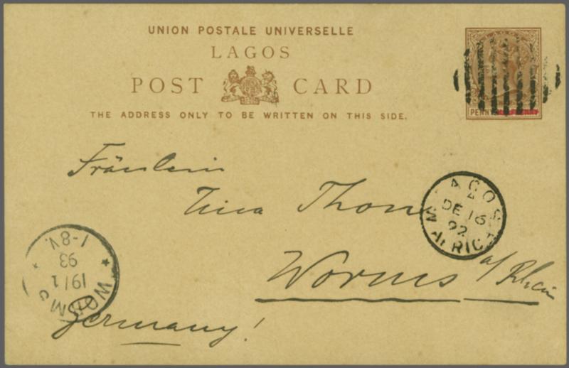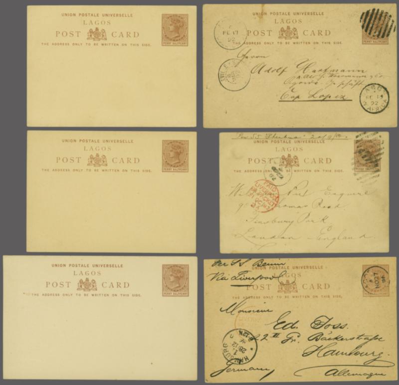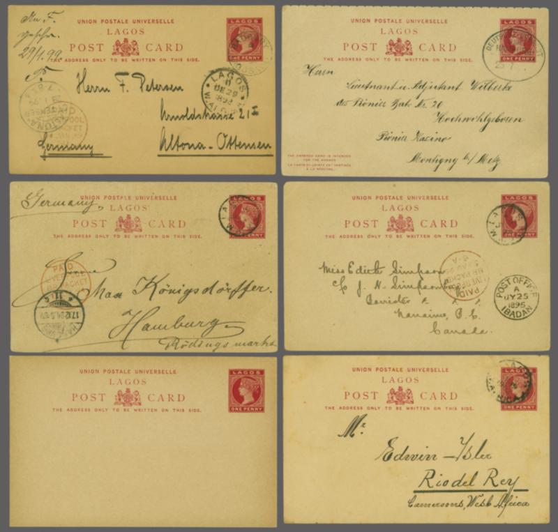 Group of six 1892 postal stationery 1 d. carmine cards. Comprising one unused and five used examples. Of those used one is a reply card (message part only) with oval "Deutsche Seepost / Hamburg" cancellation sent to Germany. Two others are also to German, one from Badagry the other Lagos. There is a