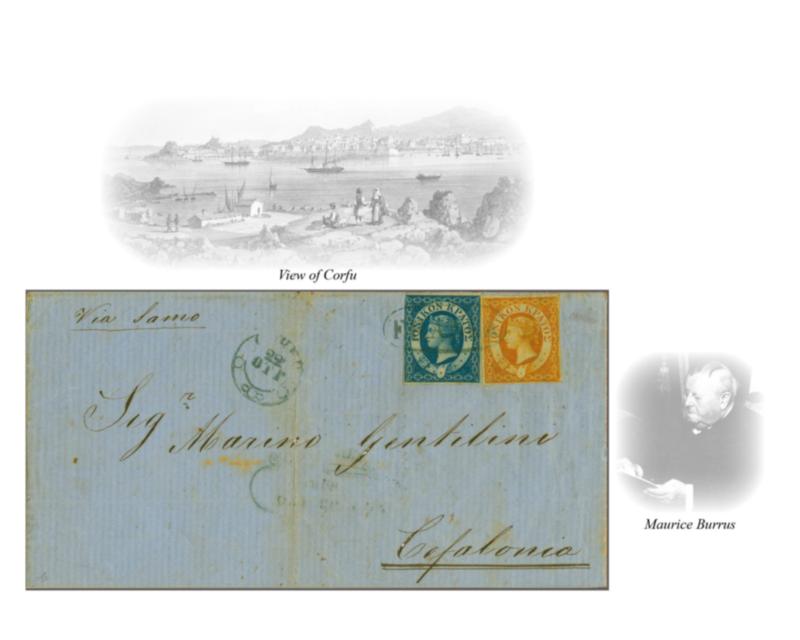 1859 (Oct 22): ½ d. yellow with large margins all round and 1 d. blue, just touched on one side, on large part 1859 cover from Corfu to Cefalonia endorsed "Via Samo", tied lightly by "FRANCA" oval handstamp with 'Corfu' cds (Oct 22) in same blue ink alongside and faint hooded Cefalonia arrival below