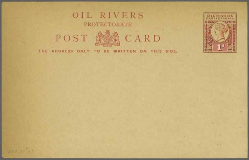Niger Coast Protectorate & Nigeria Postal Stationery 1892–1939: Important selection of 19 items, including: two 1892 1 d. vermilion cards used from Benin River with rare “BENIN RIVER” cds in black (5 July 1893) and red (7 June 1894 via S.S. Boma); two 1892 1 d. vermilion cards from Bonny River s