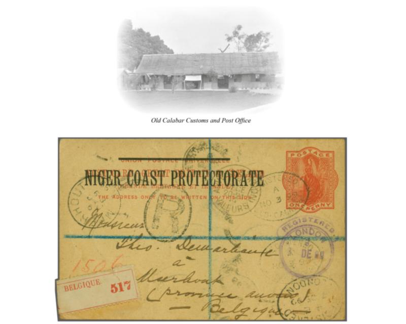 Niger Coast Protectorate 1892: Postal Stationery Card, 1 d. vermilion, used registered, sent from Old Calabar to Meerhout, Belgium, dated 3 November 1899, cancelled by a oval registered "OLD CALABAR" in black, with an additional strike alongside. Also a framed "R" handtsamp, two different "London" r