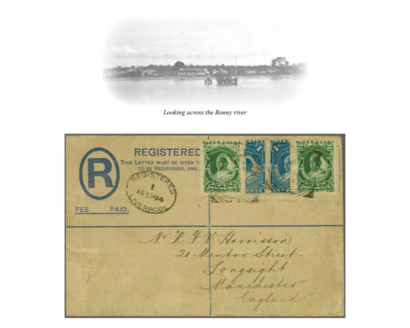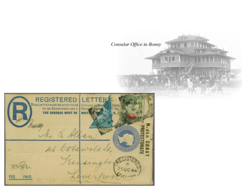 Niger Coast Protectorate Oil Rivers 1892 (July 20): 2 d. grey-green & carmine, in combination with a bisected diaginally 1894 1 d. pale-blue, used on an 1894 2 d. ultramarine registered envelope size F (H&G 4), sent from Bonny to Liverpool, England, dated 11 September 1894, tied by the squar