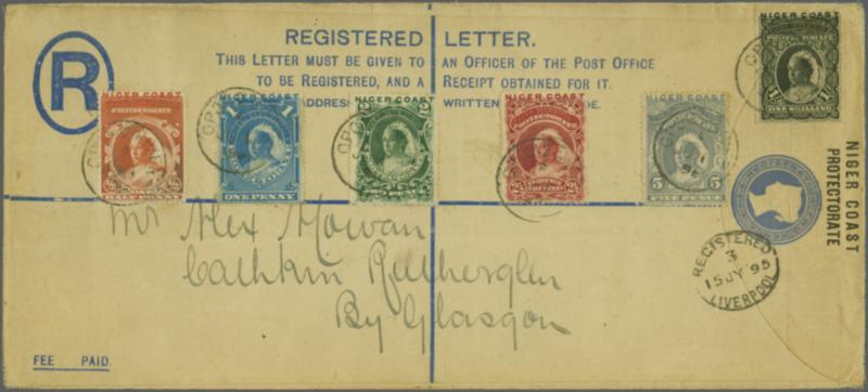 Niger Coast Protectorate 1894 (Jan 1): Oil Rivers obliterated, the complete set of six from ½ d. vermilion to 1 s. black, all used on Niger Coast 2 d. ultramarine postal stationery registration envelope size H2 (H&G 4b), sent from Opobo to Glasgow, Scotland, dated 1 June 1895, all tied by "Opobo