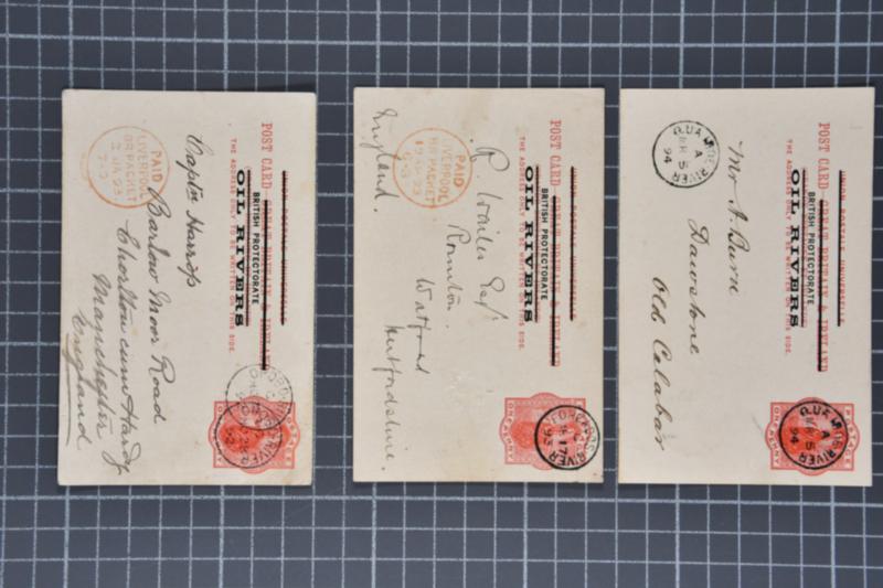 Niger Coast Protectorate Oil Rivers: Group of ten used 1892 Postal Stationery 1 d. vermilion cards. Originating from Old Calabar (5), Brass River (1), Opobo River (1), Forcados River (1) and Qua Iboe River (2 x1 manuscript cancel). Destinations include; Watford (1), Liverpool (1), Tramere (3) and Ma