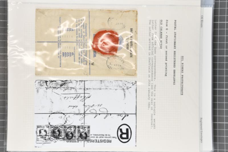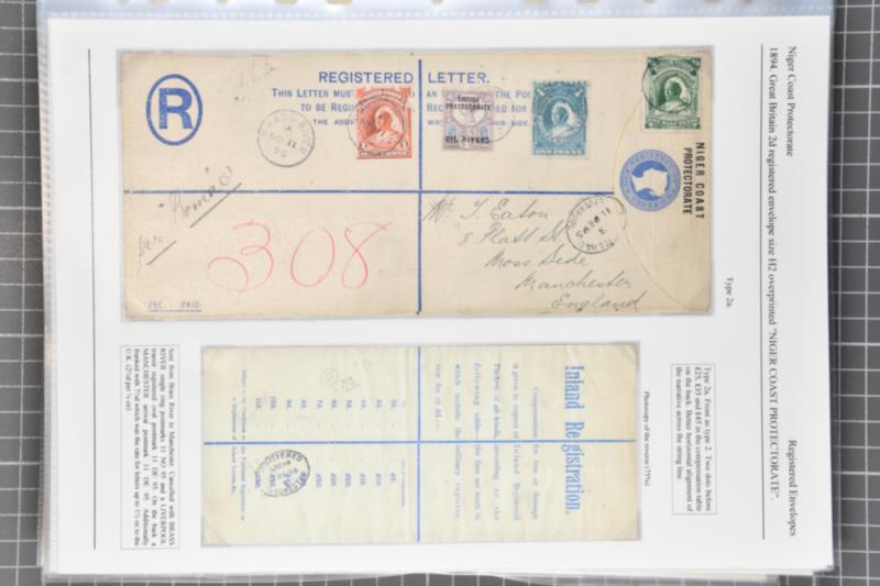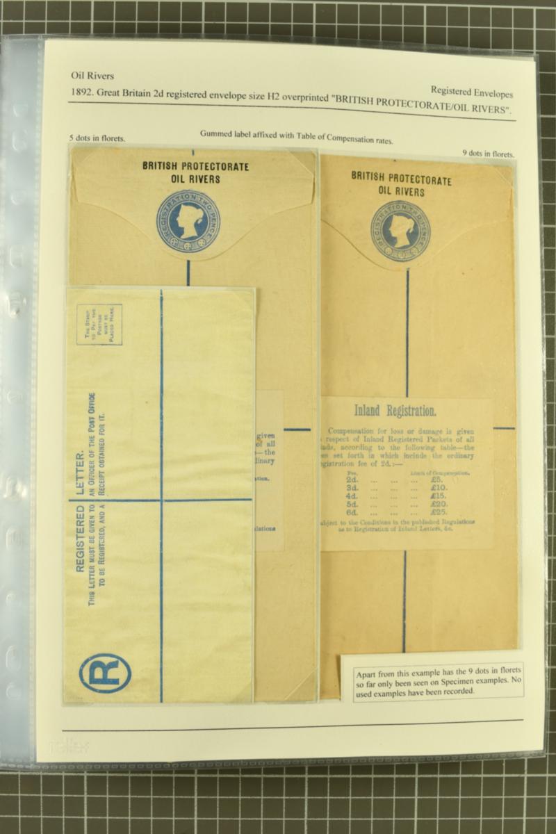 1892/97:Study of the various printings of the Oil Rivers/Niger Coast Protectorate registered postal stationery envelopes, neatly written-up upon 17 album pages, detailing the changes to text and tariff, comprising 52 covers. Almost exclusively unused, of which there are 9 Specimen examples, includin