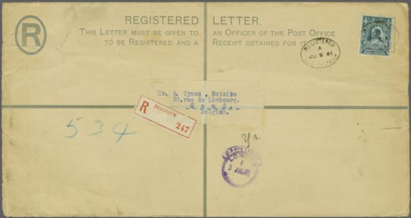 Niger Coast Protectorate 1894 (May): 2½ d. blue used on a 1897 2 d. ultramarine postal stationery registered envelope, size K (H&G 5b), sent from Old Calabar to Gand, Belgium, dated 8 June 1901, tied by an oval "Registered / Old Calabar" datestamp in black, with a 'Registered / London' hooded ci