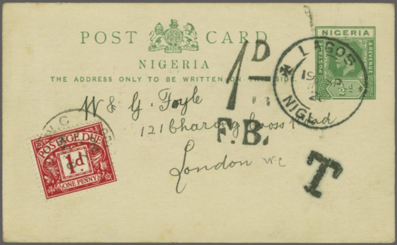 1914: Postal Card, ½ d. green, used, Lagos to London, dated 19 September 1919, cancelled by "LAGOS NIGERIA" double circle in black, with a postage due "T" mark and postage due mark "1D / F.B." alongside. On arrival GB postage due 1 d. red affixed and cancelled by an indistinct cds. To the reverse a