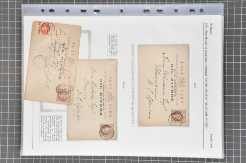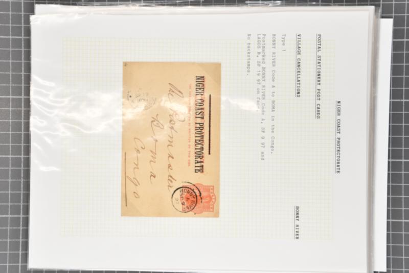Group of fourteen postal stationery post cards, plus one cover and two small pieces presented upon 12 album pages. Comprising one unused and eleven used Niger Coast Protectorate 1895 1 d. vermilion cards, organised as a postmark study, including cancels from; Brass River (3), Bonny River (2), Buguma