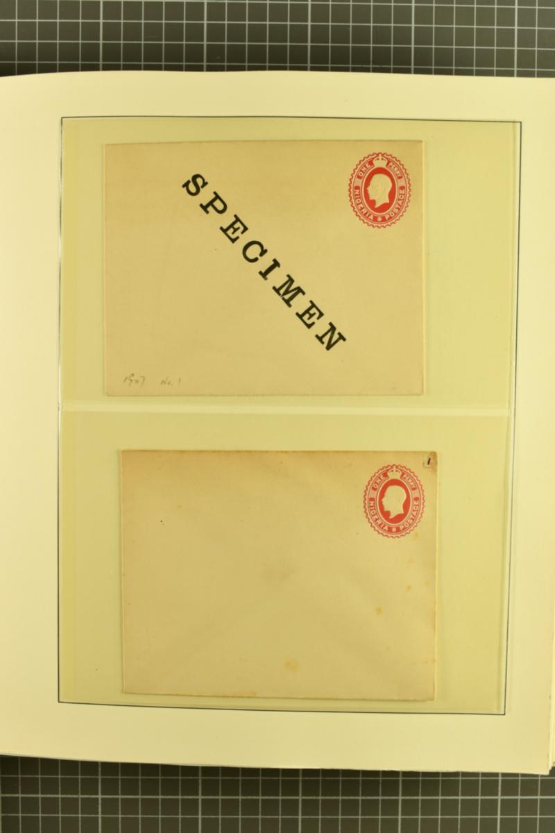 1901/12: Specialised collection of postal stationery, presented as a study upon twenty-five album pages comprising 45 covers. Includes a selection of postal stationery post cards, envelopes and registered envelopes, of which 15 are 'SPECIMEN' examples, 14 unused and 16 used. Several better examples