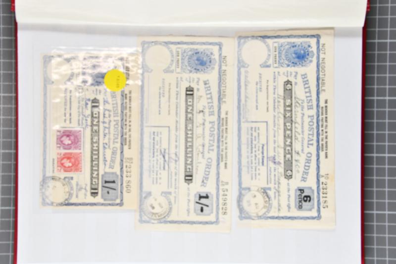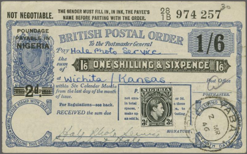 Postal Orders: 1948-1956 Group of five King George VI British Postal Orders overprinted for use in Nigeria. Includes 1 s. 6 d. blue with overprint type T3T 2d. over 1½ d. poundage issued at Yaba 2 March 1946 with 3 d. stamp affixed increasing the value to 1 s. 9 d. (only recorded example).; 5 s. blu