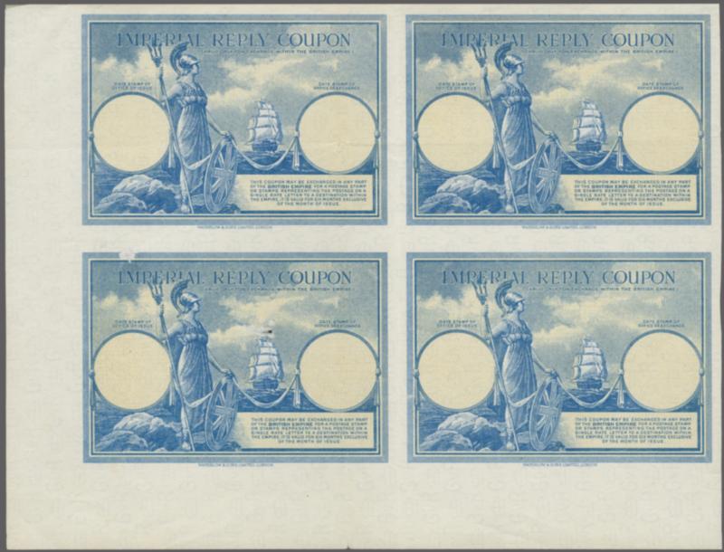 International Reply Coupon 1927: Imperial type, Proof, imperforate bottom left corner marginal block of four, printed on block cypher watermarked paper, with "WATERLOW & SONS LIMITED LONDON" imprint, without printing to reverse, from the original sheet of nine. Has two vertical creases, one heav