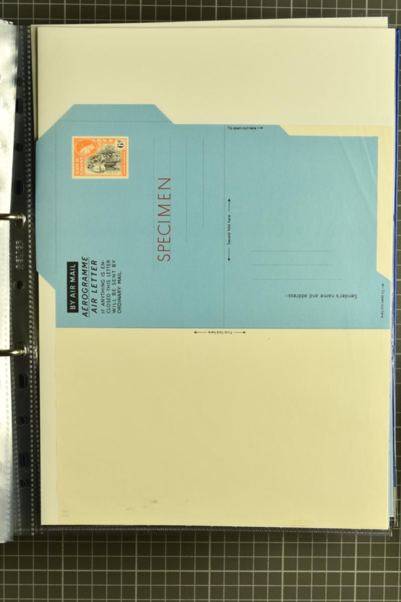 1953: Ife Bronze 6 d. aerogramme with indicium outline perforations, overprinted 'SPECIMEN' in red to address lines and the indicium with perforated 'SPECIMEN' in a horseshoe. Numbered by a black handstamp "127" on the reverse of the unfolded sheet in upper right corner. Very fine and scarce. Comes