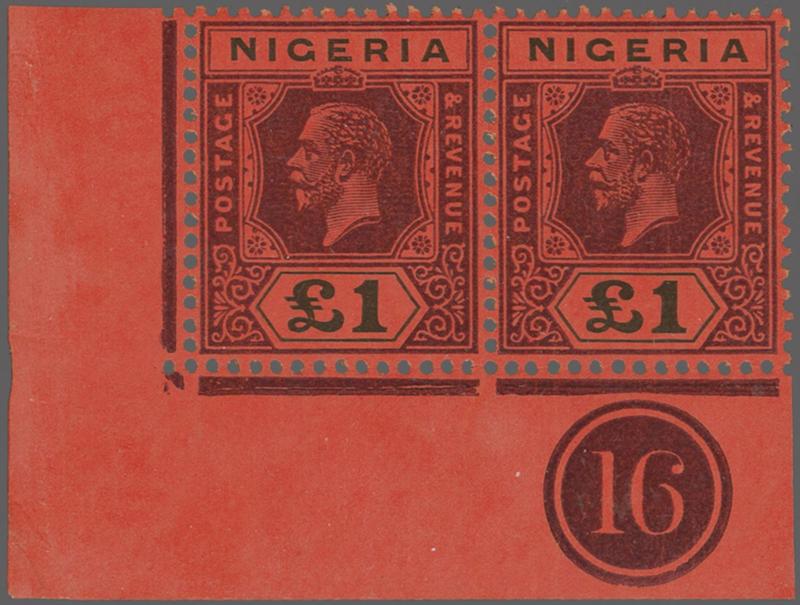 1927: £1 purple & black on red chalk-surfaced paper, wmk. Multiple Crown CA, die II, bottom left corner marginal control "16" horizontal pair, original gum, fresh vibrant example, very fine to superb, creasing in left margin and one pulled perf. top, beautiful piece. Much scarcer than catal
