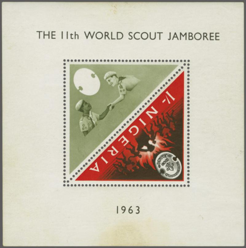1963: THE 11th WORLDSCOUT JAMBOREE, unused and unmounted souvenir sheet with the red printing omitted from the 3d value. The souvenir sheet displays very minor light toning and has two little offset spots on the back from printing colour. Included is a normal souvenir sheet for comparison.B.P.A. SG